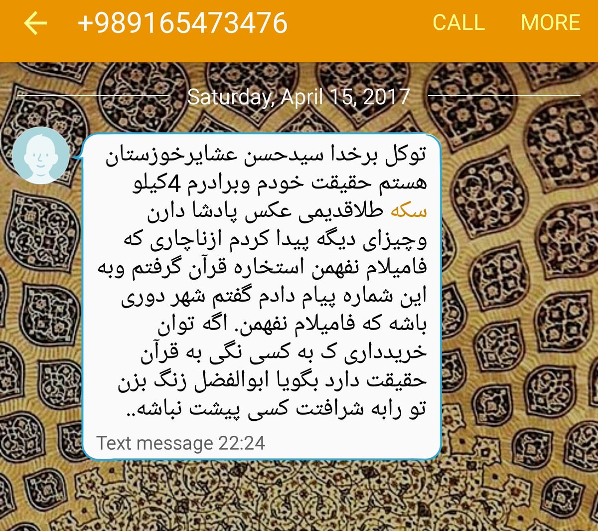 «سلام برادر من سیدرسول هستم، راننده تراکتور. داشتم زمین شخم می‌زدم، مقداری سکه با مجستمه پیدا شود، استخار گرفتم، به اباالفظل شمار شما خوب آمد، پیام دادم کمک کنی، بفروشی، اباالفظلی هرچه بردن، نصم نصم، تو را به فاطمه زهرا کمک کن، به کسی نگو، اگر پلیسی بگو».